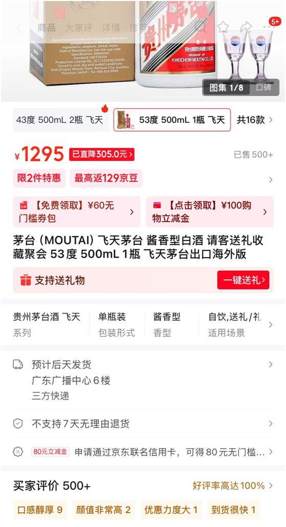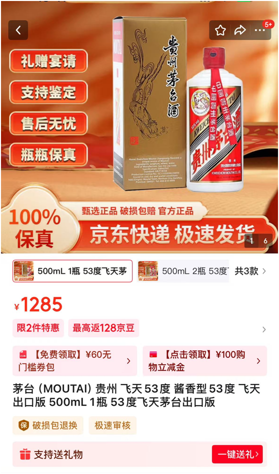 值得一提的是,飞天茅台出口版售价已跌破1300元。7月13日,在京东,有店铺飞天茅台出口版的售价低见1285/瓶,店家称支持鉴定,100%保真,京东快递;有店铺售价报1288元/瓶,页面显示支持官方机构鉴定,买家评价100+,好评率达100%;有店铺售价报1290元/瓶,页面显示有线下实体,买家评价100+,好评率达100%等信息;此外,还有多家店铺售价报1295元/瓶,有店铺页面显示买家评价500+,好评率达100%。