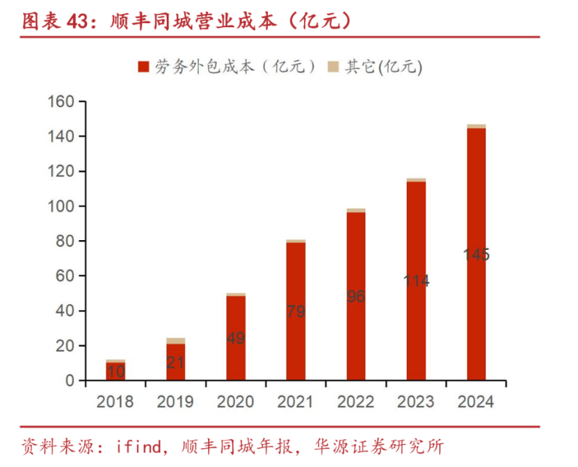 其次,顺丰同城的订单规模较小,更难摊分人力成本。过去几年,顺丰同城在人力外包成本上的支出逐年递增,占总营业成本比重约90%。