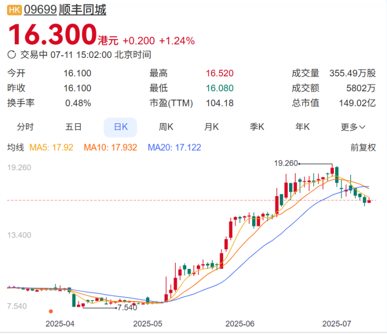 自今年5月开始,顺丰同城的股价便一路狂飙,从5月8日的7.93元一路涨至最高的19.26元,涨幅约为142%。