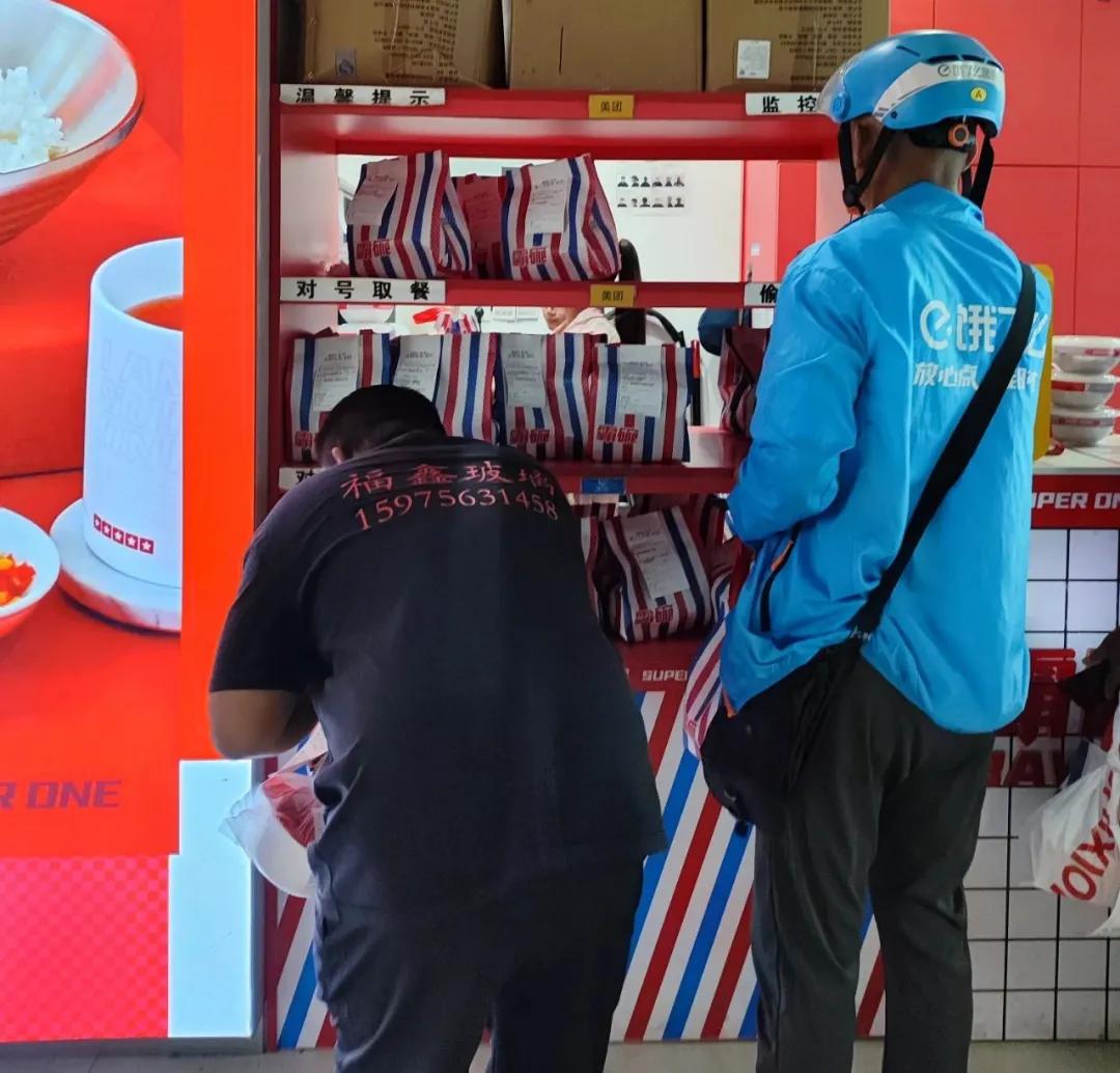 甚至因为订单太多,商家来不及出餐,有骑手进入后厨开始现场制作水饺、做奶茶。