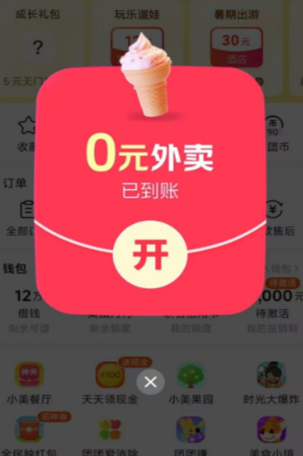 美团APP开屏后就跳出“0元外卖已到账”的超大图标,点击后账号内便已收到系统发放的零元外卖兑换券,包含配送和自提两种。其中瑞幸咖啡、蜜雪冰城、古茗等为“0元购”高频出现的品牌。