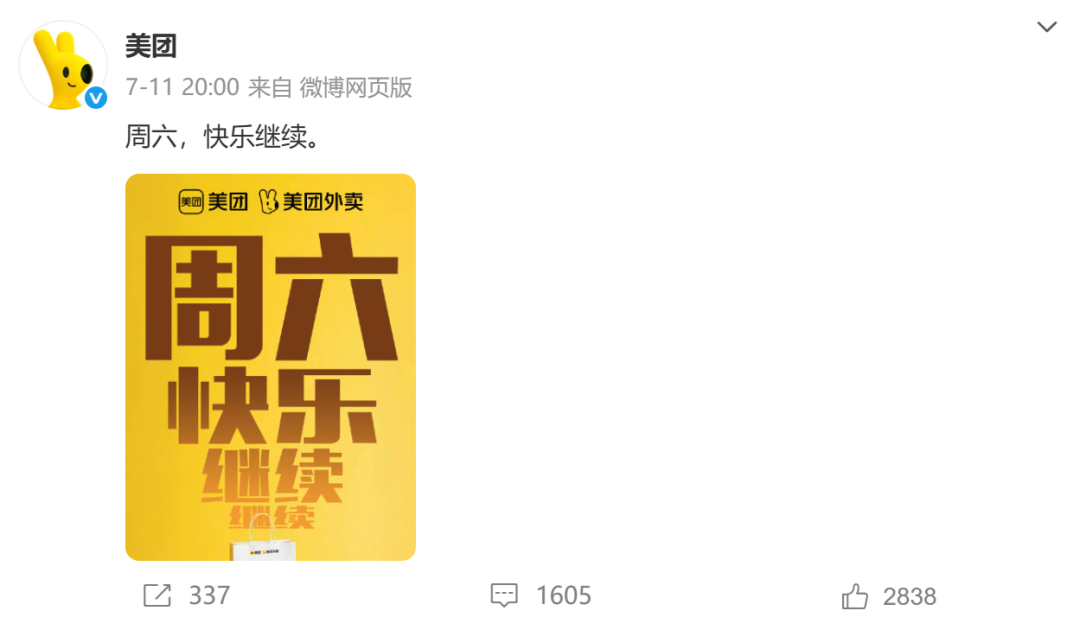 7月11日晚,外卖“疯狂星期六”再次上演,美团外卖发布微博表示:“周六,快乐继续。”