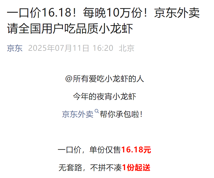 京东外卖则发文:《一口价16.18!每晚10万份!京东外卖请全国用户吃品质小龙虾》。