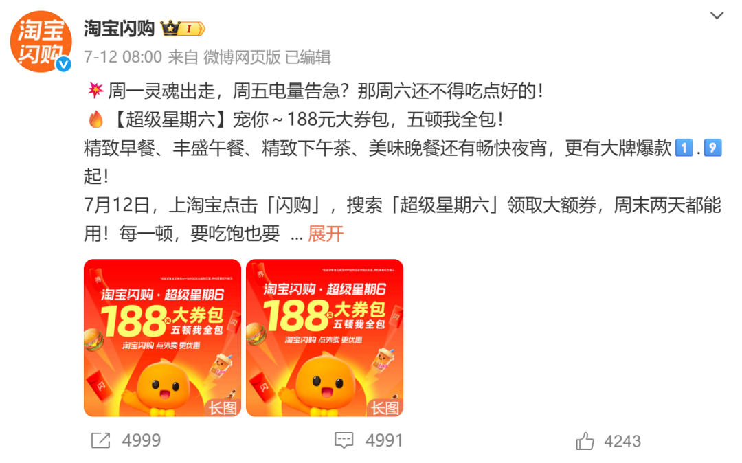 淘宝闪购也没闲着,打出“超级星期六”的口号,释放188元大券包,宣称“1天5顿我全包”。不少用户都基本上拿到了多张“满18.8减18.8”、“满28.8减18.8”的大额券。据界面新闻,7月12日一早,一名外卖员介绍,由于淘宝闪购放出了大额减免券,商家从早上开始便订单爆满,出餐时间比平时慢了不少。