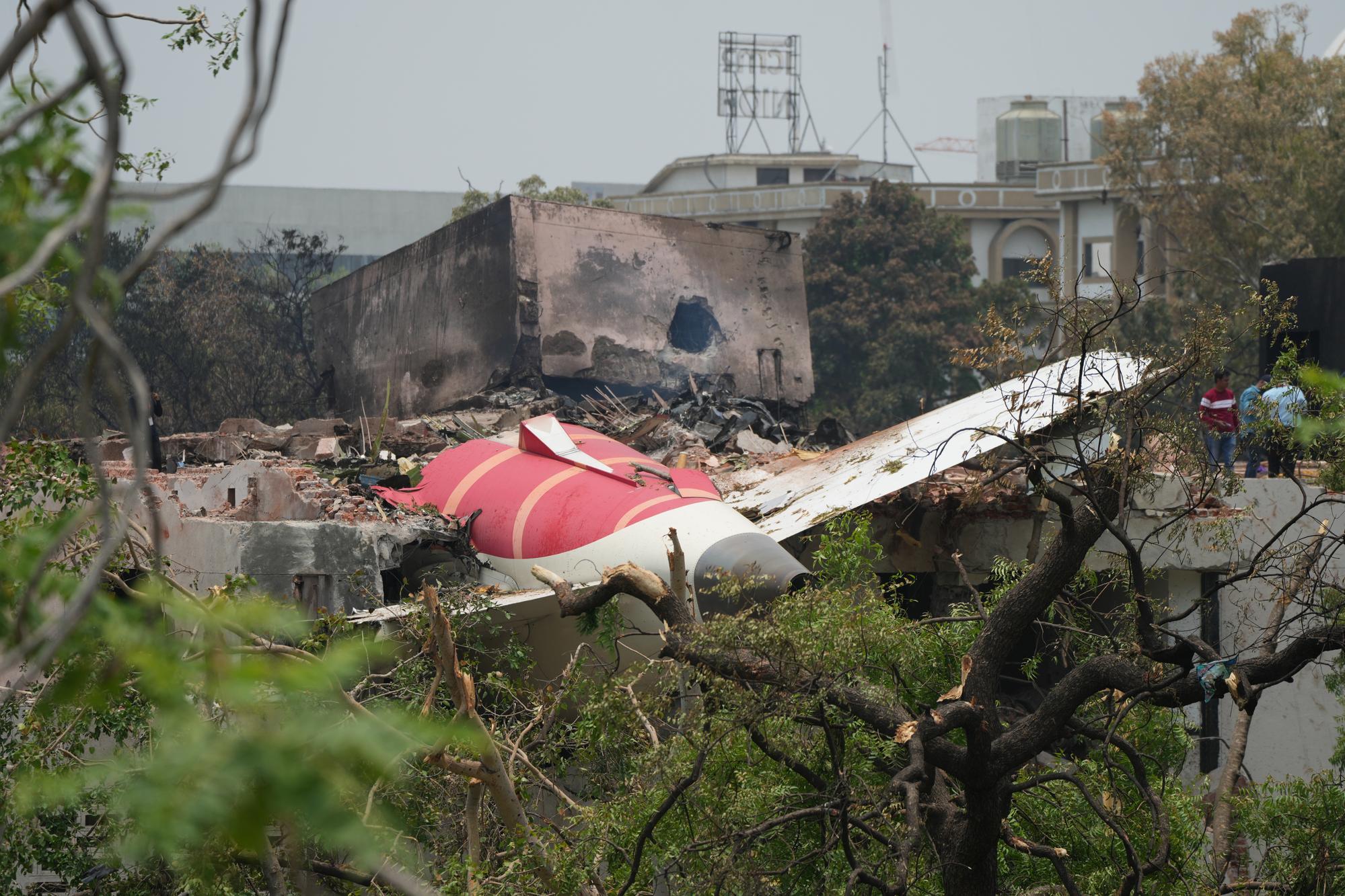 6月13日,在印度古吉拉特邦艾哈迈达巴德,几名男子站在客机残骸旁。新华社发