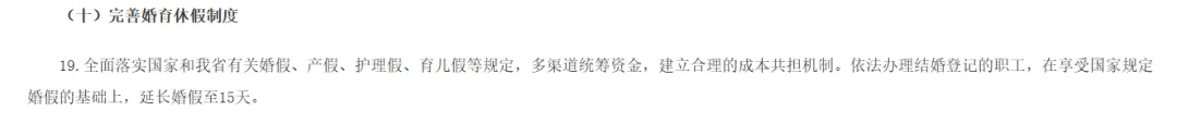 湖北省人民政府办公厅7月14日印发《关于加快完善生育支持政策体系更加务实有效建设生育友好型社会的若干措施》。其中提到,全面落实国家和湖北省有关婚假、产假、护理假、育儿假等规定,多渠道统筹资金,建立合理的成本共担机制。依法办理结婚登记的职工,在享受国家规定婚假的基础上,延长婚假至15天。