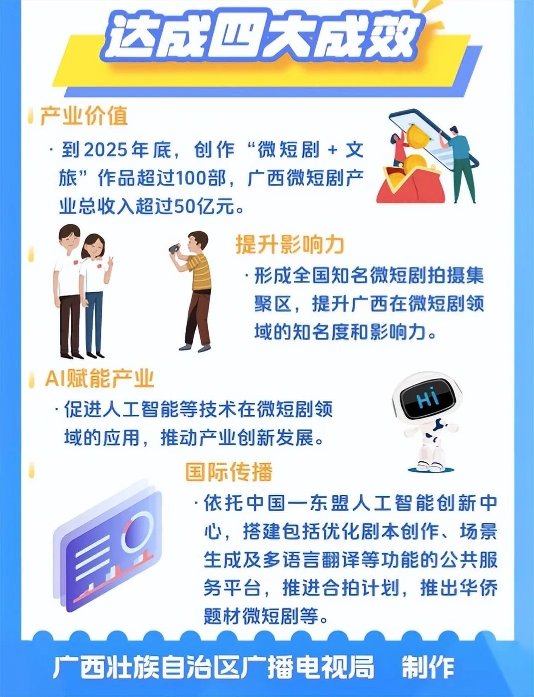 这是地方政策大力帮扶短剧文旅的典型缩影。甚至更重磅的还有,山东以“3年投入10亿元、单项目最高补贴500万元”成为全国最高奖金扶持力度;广西提出了“到2025年底实现创作‘微短剧+文旅’作品超过100部,全省微短剧产业总收入超过50亿元”的愿景。