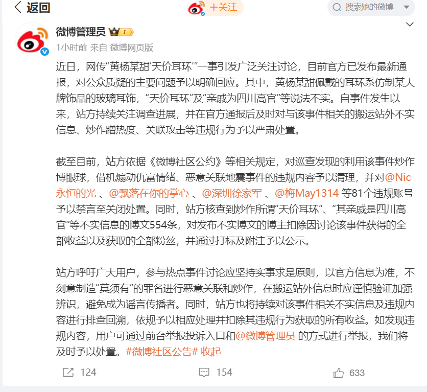 截至目前,站方依据《微博社区公约》等相关规定,对巡查发现的利用该事件炒作博眼球,借机煽动仇富情绪、恶意关联地震事件的违规内容予以清理,并对@Nic永恒的光 、@飘落在你的掌心 、@深圳徐家军 、@梅May1314 等81个违规账号予以禁言至关闭处置。同时,站方核查到炒作所谓“天价耳环”“其亲戚是四川高官”等不实信息的博文554条,对发布不实博文的博主扣除因讨论该事件获得的全部收益以及获取的全部粉丝,并通过打标及附注予以公示。