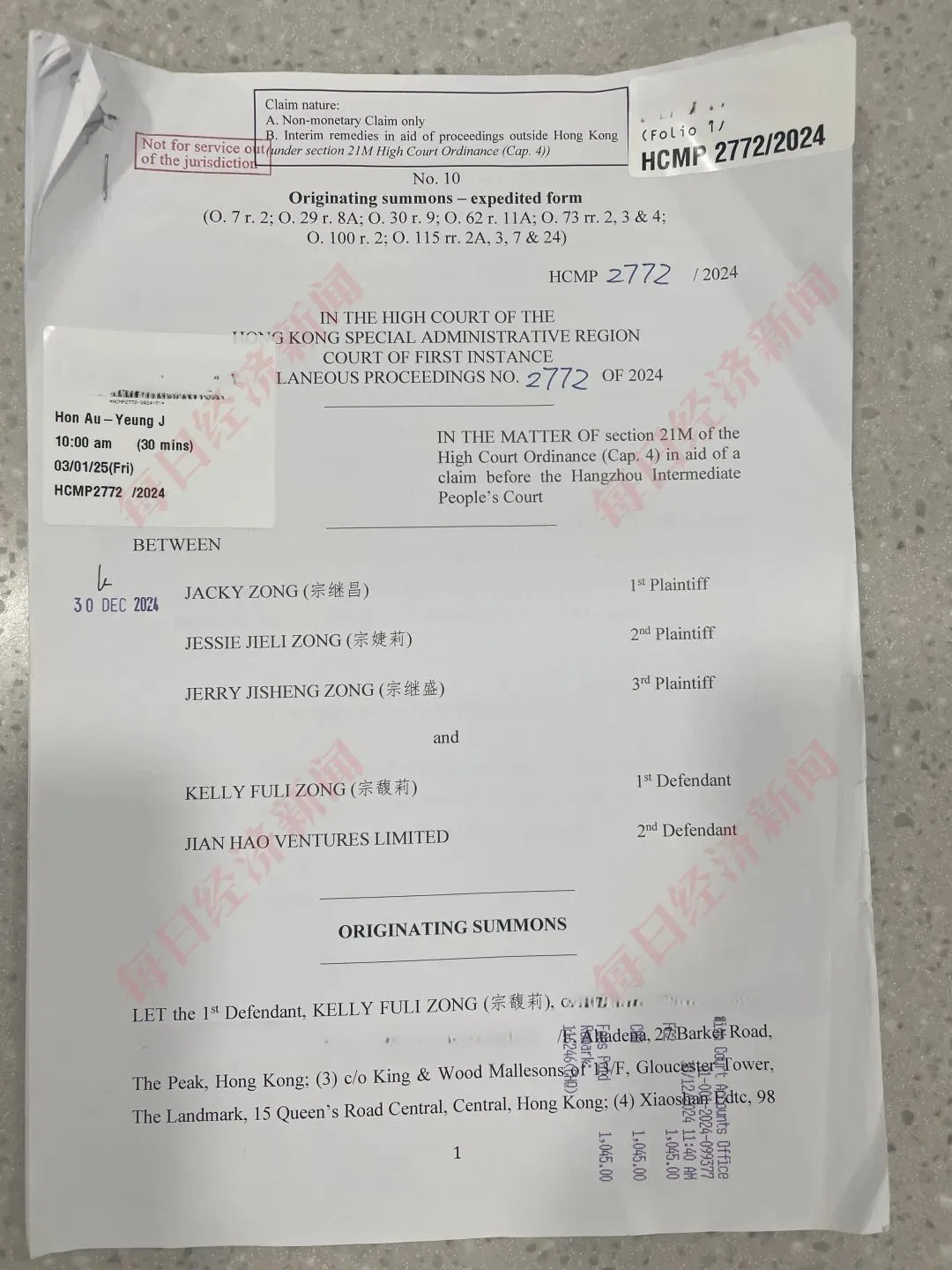 该法律文书显示,案件原告方三人分别为Jacky Zong(宗继昌)、Jessie Jiele Zong(宗婕莉)、Jerry Jisheng Zong(宗继盛),被告方为Kelly Fuli Zong(宗馥莉)(第一被告人)和Jian Hao Ventures Limited(第二被告人,一家在英属维京群岛注册的公司)。