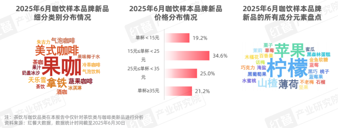 2025年6月,红餐产业研究院监测到有23个咖饮品牌共推出了78款新品,其中茶饮类和咖啡类新品一共有53款,烘焙类和甜品类新品总共有6款。从咖啡类与茶饮类的新品细分类别来看,主要有美式咖啡、拿铁、冷萃咖啡、果咖、茶咖、气泡咖啡、果茶、奶茶等。