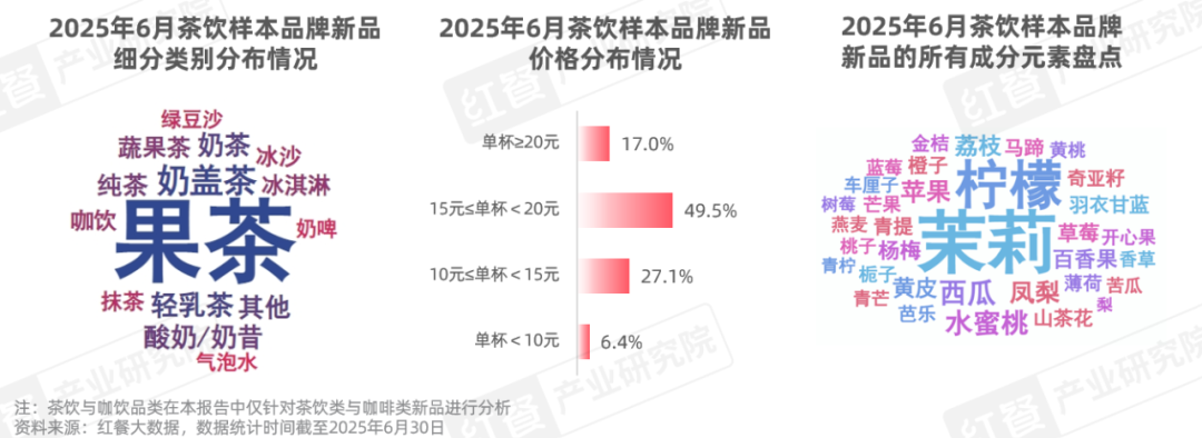 从价格分布来看,6月茶饮新品价格主要集中在15元≤单杯<20元和10元≤单杯<15元两个区间内,占比分别为49.5%和27.1%,而10元以下和20元及以上区间的新品则相对较少,占比分别为6.4%和17%。