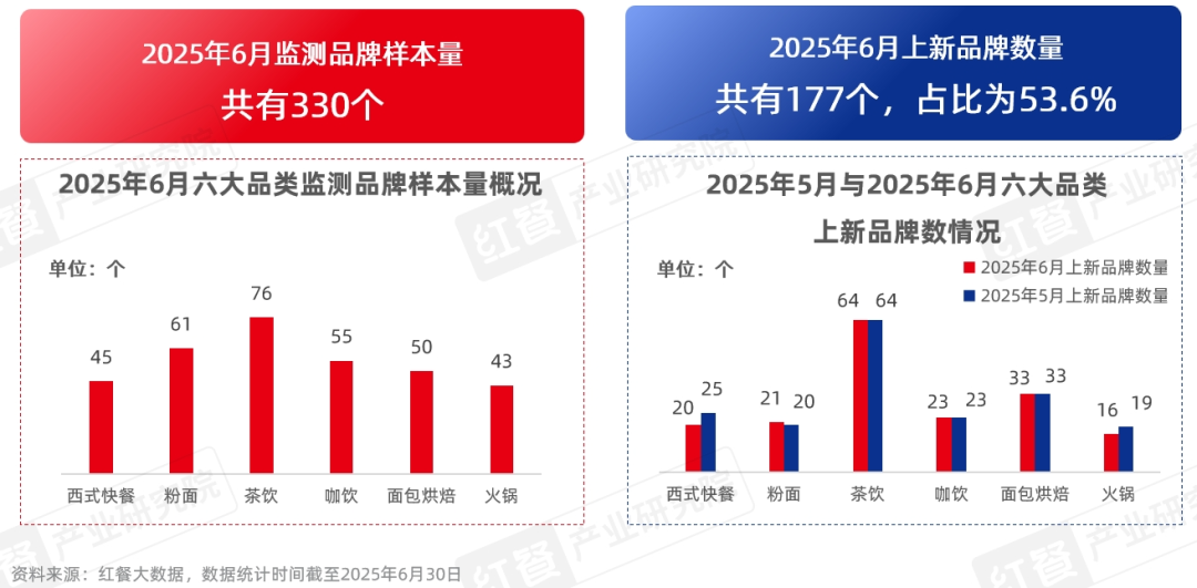 为洞悉餐饮行业产品上新发展趋势,红餐产业研究院选取了餐饮行业具有代表性的六个品类作为监测对象,包括西式快餐、粉面、茶饮、咖饮、面包烘焙、火锅这六大品类。在2025年6月,红餐产业研究院监测的六大品类的品牌样本量一共有330个,总计有177个品牌推出新品,占监测品牌样本量的53.6%。