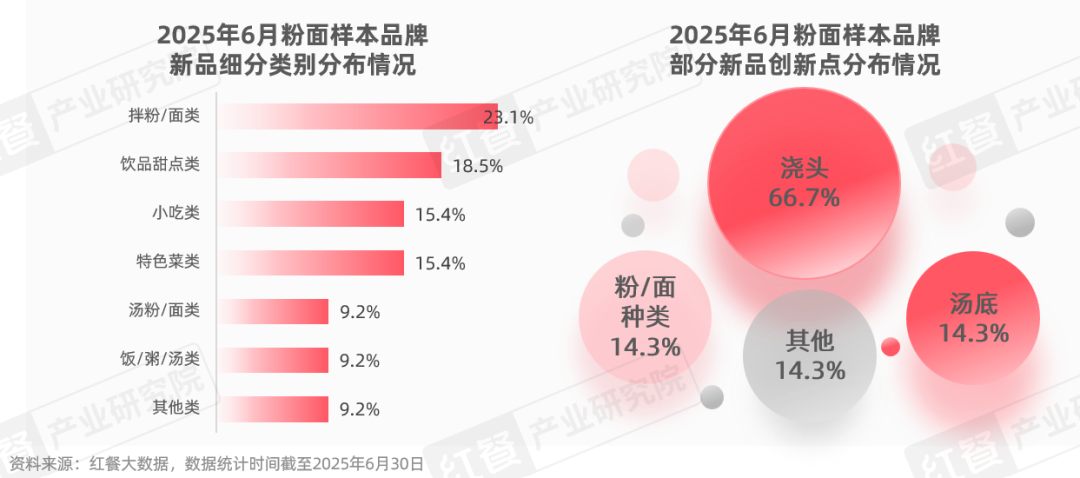 2025年6月,在红餐产业研究院监测的61个粉面品牌中,有21个品牌共推出了65款新品,当月粉面新品涵盖的类别有拌粉/面类、饮品甜点类、小吃类、特色菜类、汤粉/面类和饭/粥/汤类。