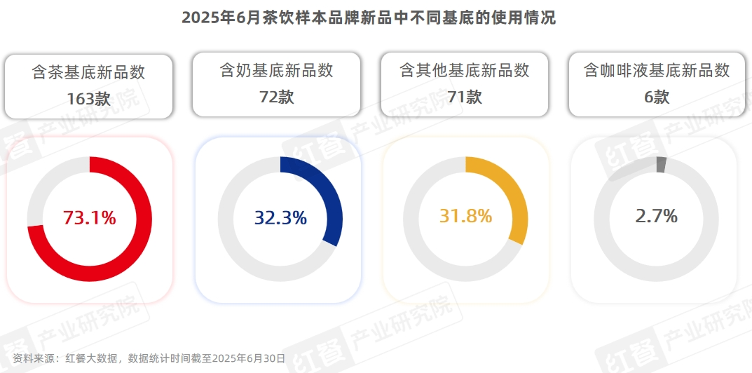 从茶饮类和咖啡类新品使用的基底来看,茶饮样本品牌推出的新品中,含茶基底的新品数有163款,占比为73.1%,相较5月,数量有所下降,占比则提升了4.5个百分点;所有新品中,有72款新品含有奶基底,占所有总数的32.3%,相较于5月,数量和占比均有所下降;所有新品中有71款新品使用了其他基底,占比达31.8%,与5月相比,数量和占比均有小幅增长。