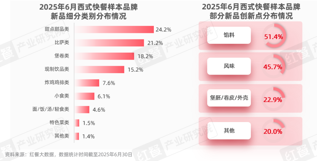 2025年6月,红餐产业研究院监测的西式快餐品牌中有20个品牌共推出了66款新品。从新品的细分类别来看,当月新品涵盖的类别有甜点甜品类、比萨类、堡卷类、现制饮品类等9种。