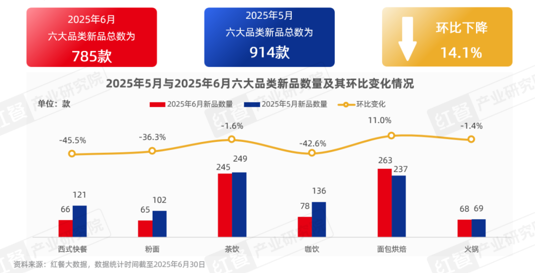 为洞悉餐饮行业产品上新发展趋势,红餐产业研究院对六大餐饮品类的品牌在2025年6月的上新情况做了监测,并整理发布了《餐饮行业产品上新报告(2025年6月)》。