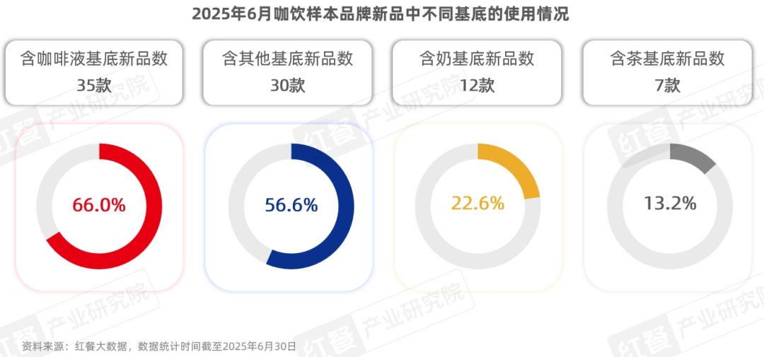 此外,从茶饮类和咖啡类新品使用的基底来看,咖饮样本品牌推出的新品中,咖啡液基底是占比最高的基底,含咖啡液基底的新品占总数的66%;含其他基底的新品有30款,占比为56.6%,与5月相比,占比大幅提升;而奶基底和茶基底的应用有所减少,新品数占比分别为22.6%、13.2%。