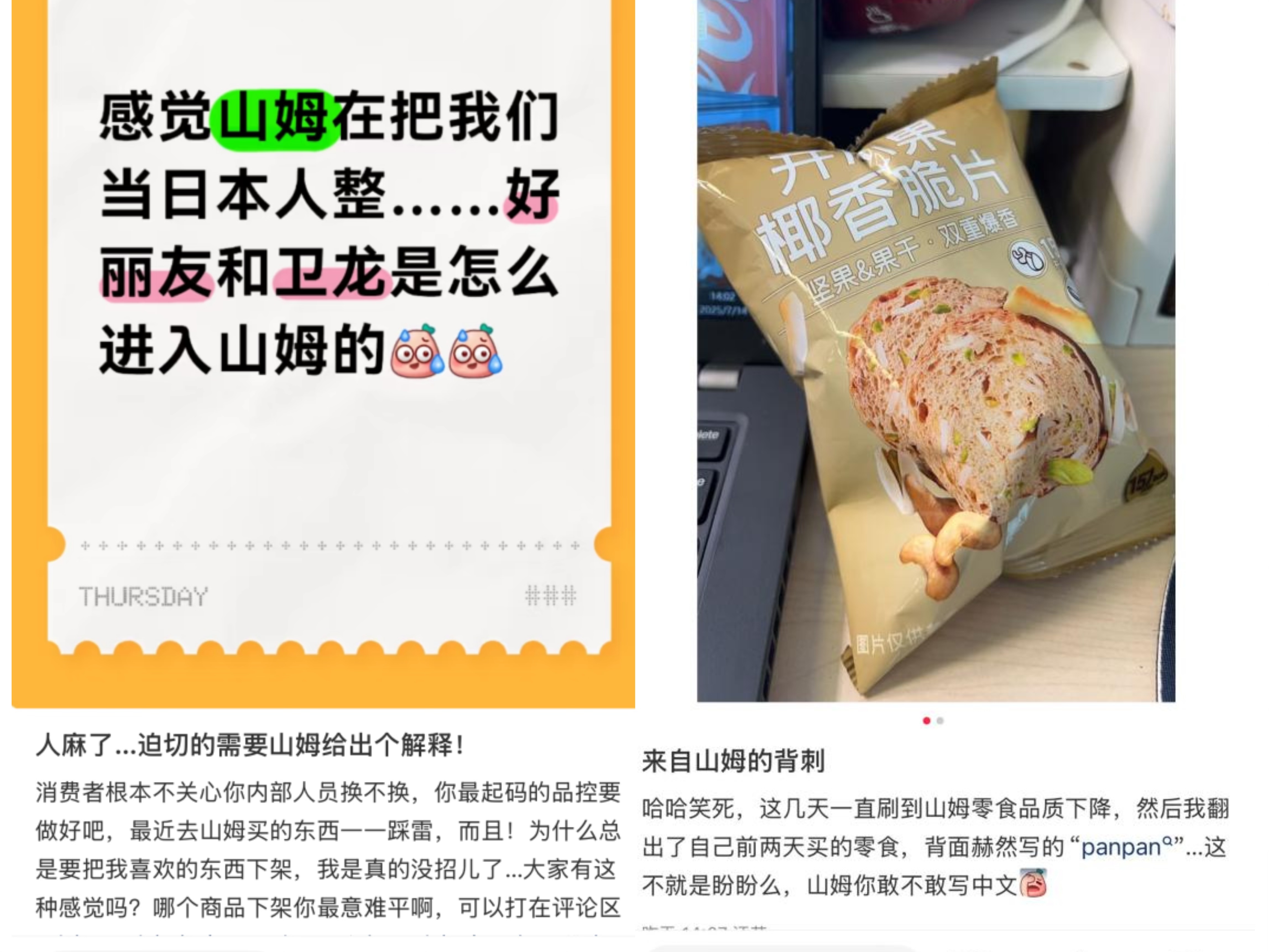 从这个角度来看,山姆此次在小红书上被口诛笔伐似乎也不算“冤枉”了。毕竟,对于左手抢99元烤鸡,右手拎着LV背包,主打“精明消费”的中产群体来说,过往的山姆,既为其满足了实用主义,又保留了体面感。但当好丽友、徐福记等大众品牌,登上“精英货架”时,尤其是他们还发现“山姆严选≈大润发同款”时,心态彻底崩了。