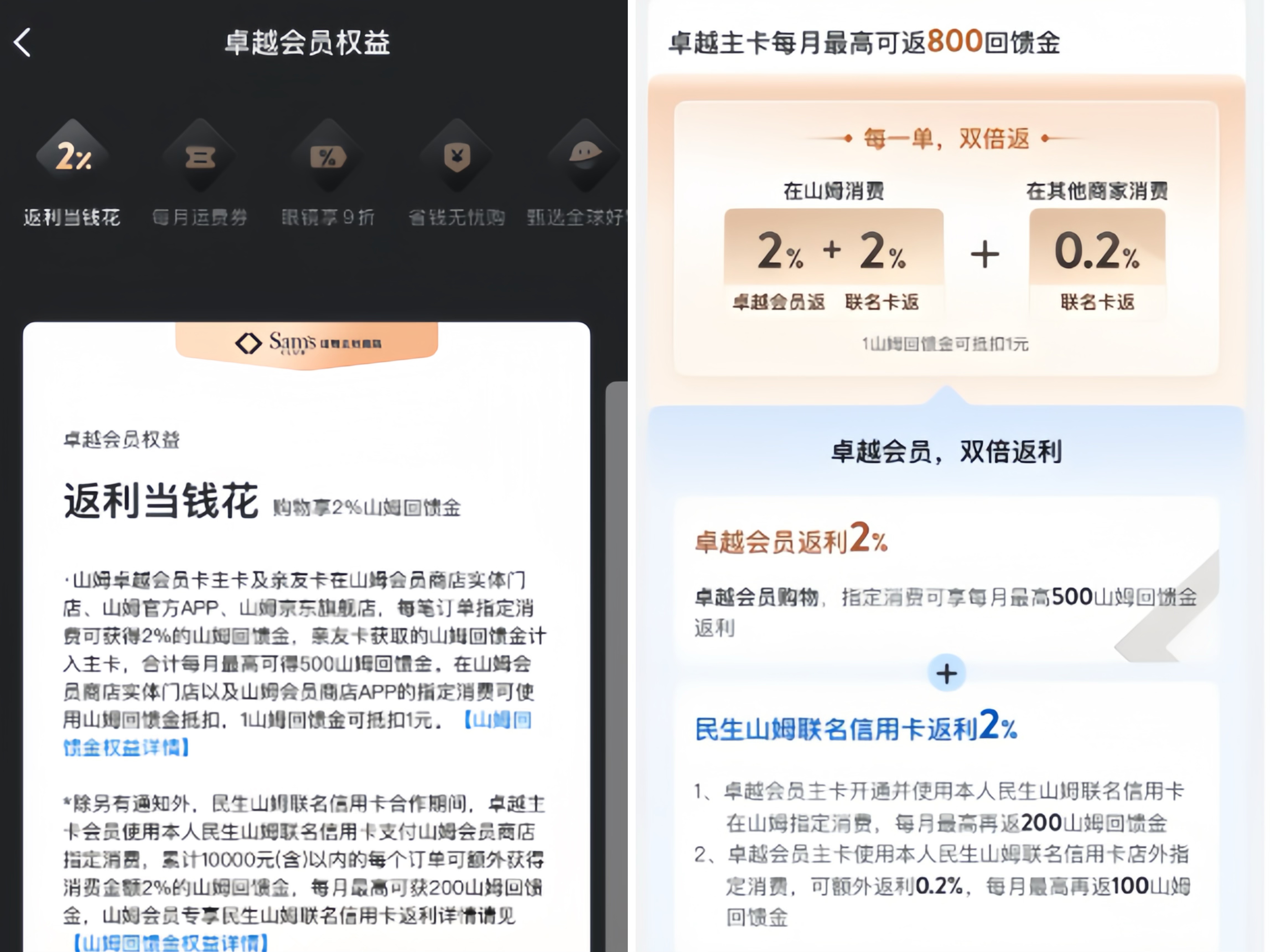 壹度PRO注意到,原本山姆的卓越会员积分制规则是消费1元返2积分,每满1000积分兑换10元优惠券,但在其后续上新的回馈金规则下,山姆卓越主卡会员的返利规则调整为“购物享2%山姆回馈金”,同时,持有民生山姆联名信用卡的会员,可以在上述2%的基础上(每月最高500元),再获得额外2%的返利(每月最高200元),上述返利最终将以山姆回馈金的方式,返还至山姆会员回馈金账户。