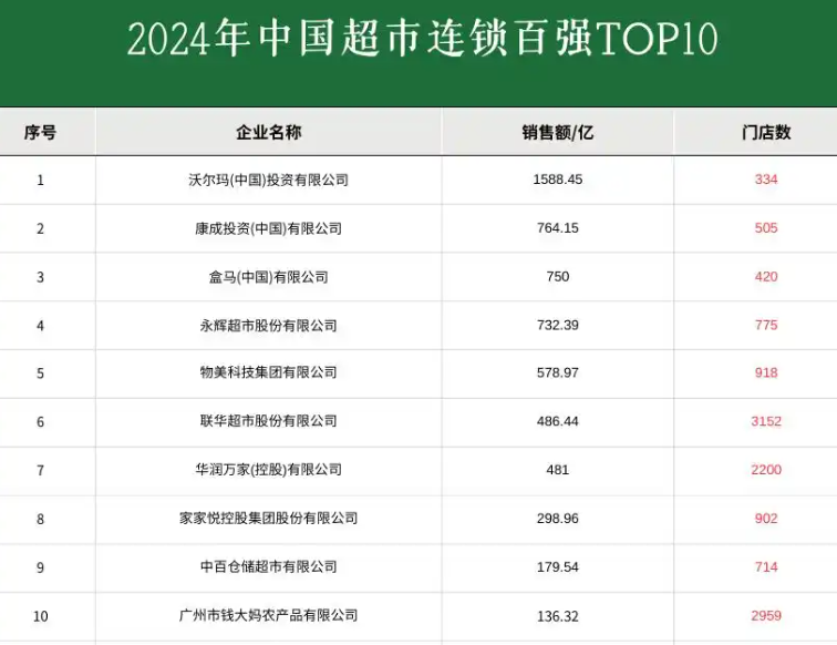 在2024年中国超市连锁百强TOP10排名中,沃尔玛凭借着1588余亿元的销售额位列榜首,同时,据媒体报道,这一年山姆的销售额或已突破1000亿元,但相较沃尔玛稳居榜首的“不变”,这一年榜单最大的变化在于,盒马凭借750亿元的销售额首次闯进全国超市排名前三,进一步拉近了与山姆的身位差距。