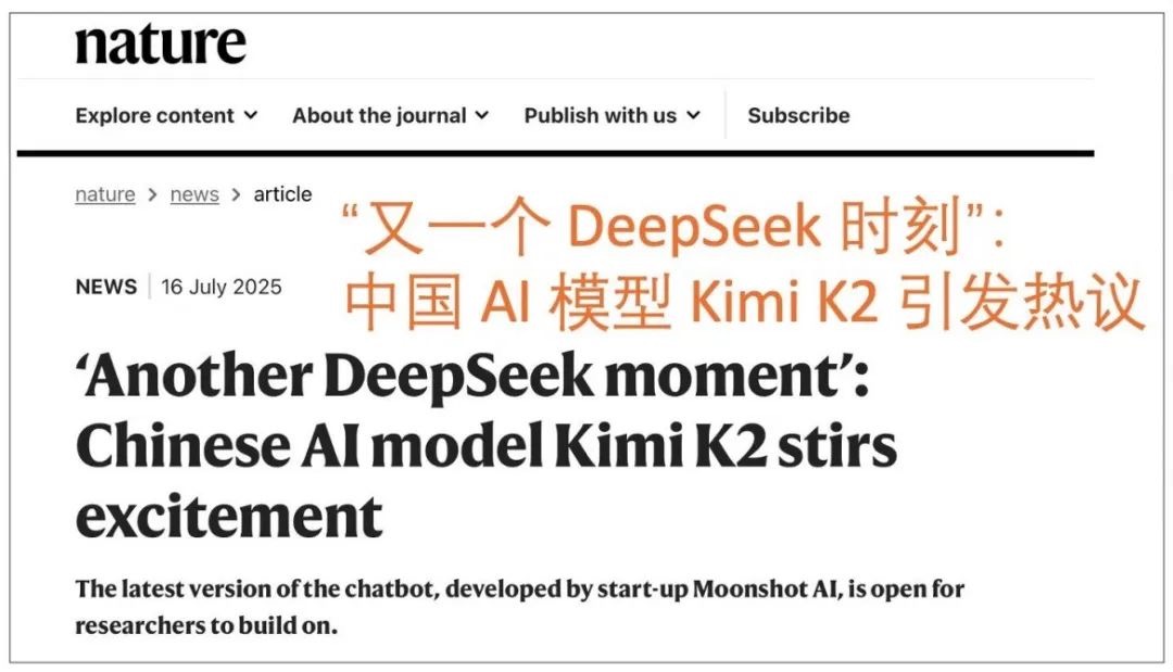 《自然》杂志网站更是将Kimi K2发布称为“世界迎来又一个DeepSeek时刻”,满满的都是“Make Kimi Great Again”既视感。