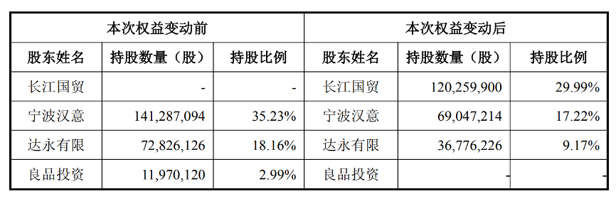 本次权益变动后,宁波汉意及其一致行动人宁波良品合计持有公司股份6905万股,占公司总股本的比例为17.22%。