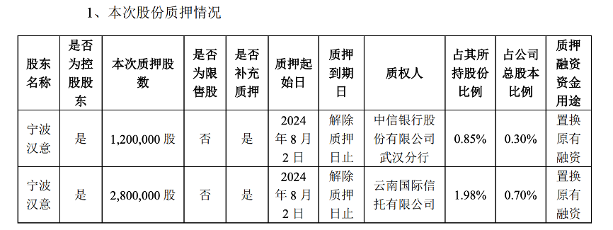 值得注意的是,宁波汉意长期进行股权质押,而用途则为置换原有融资。这意味着其有着不小的还款压力。
