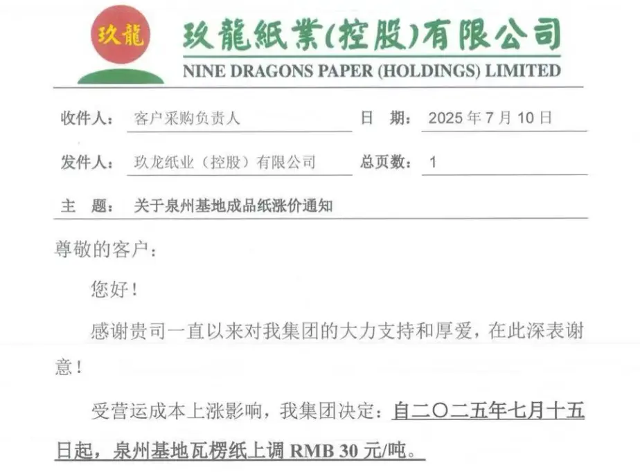 7月15日,她实控的玖龙纸业,正式执行新一轮调价,东莞、泉州基地的瓦楞纸价格上调30元/吨。