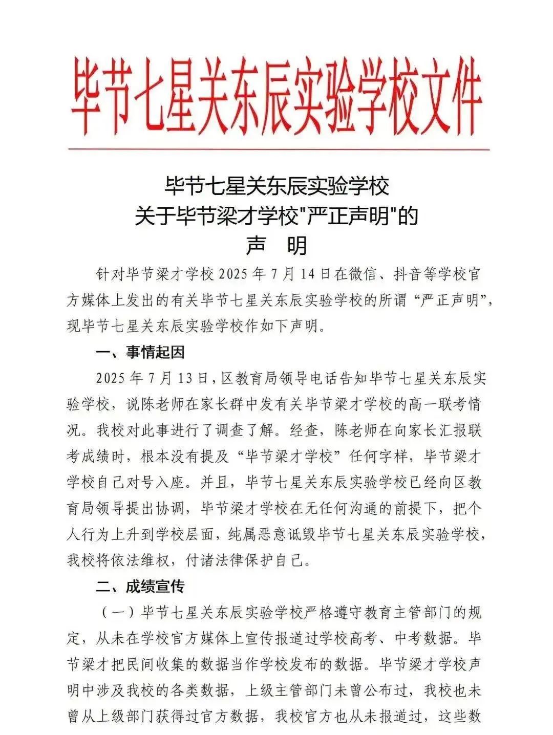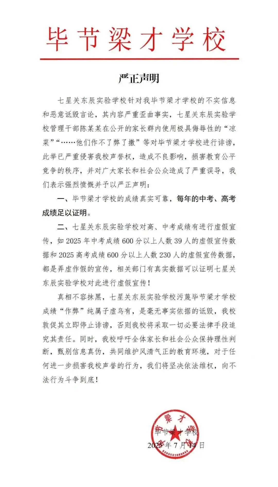 针对毕节梁才学校的声明,当天,毕节七星关东辰实验学校也在其官方账号发布声明,指毕节梁才学校是自己对号入座。