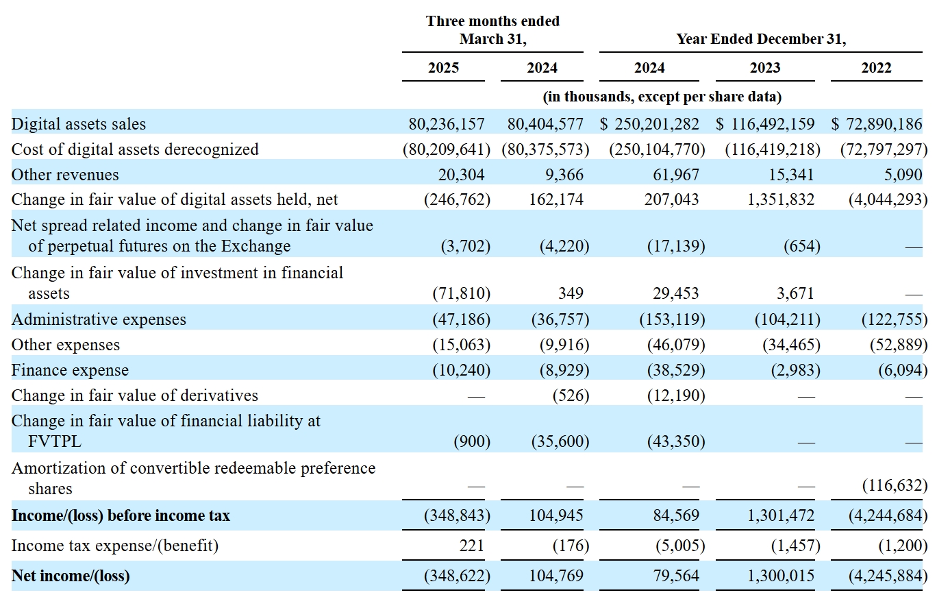 财务数据显示,Bullish今年一季度的数字资产销售额为802亿美元,与去年同期相当,但净亏损为3.48亿美元,去年同期净盈利1.04亿美元。