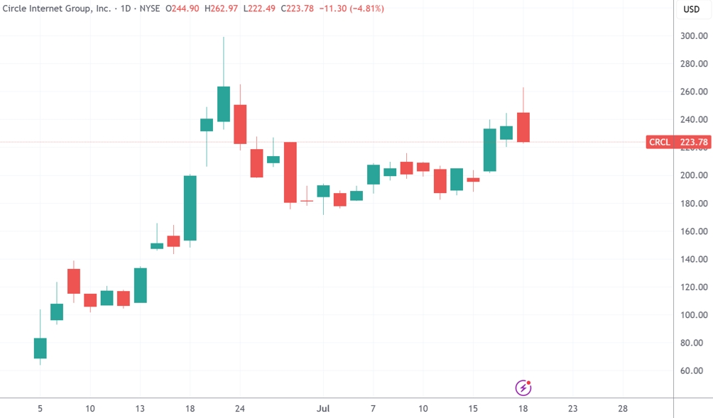 横向对比,Circle在今年4月1日提交S-1表,后续卡在美国参议院审批稳定币法案过程中上市。自6月5日挂牌交易开始,公司股价从31美元的发行价,最高摸到298美元。最新收盘价为223美元,对应498亿美元的市值。考虑到USDC目前的发行量只有647亿美元,这波炒作已经大幅计入稳定币极速发展的提前量。