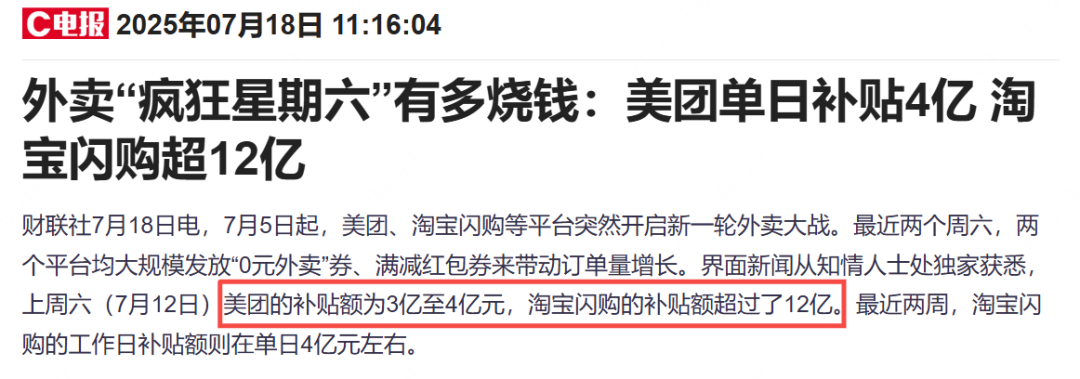 据界面新闻报道,上周六(7月12日)美团的补贴额为3亿至4亿元,约为淘宝闪购的四分之一,单量却达到1.5亿。