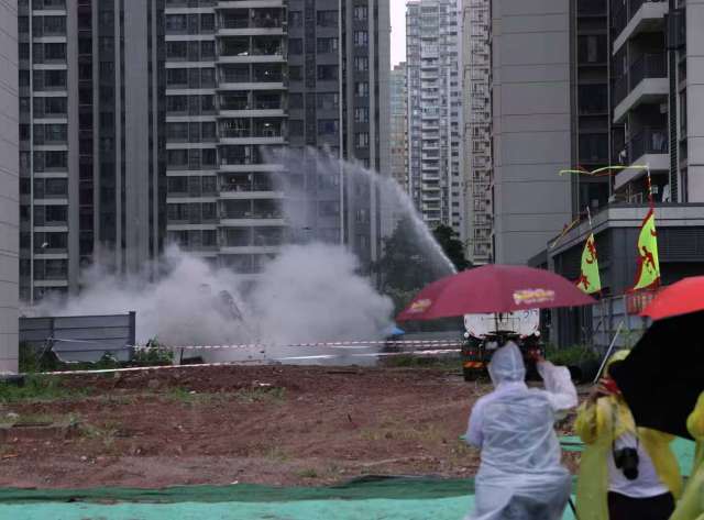 警戒线外,挤满了冒雨前来、举着手机拍摄的村民;对面回迁房的阳台上,大家齐齐等待。
