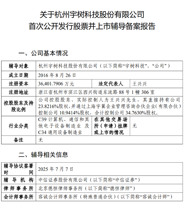 7月18日,中国证监会官网显示,杭州宇树科技股份有限公司(下称“宇树科技”或“公司”)开启上市辅导,辅导机构为中信证券。这表明,公司正式启动IPO。