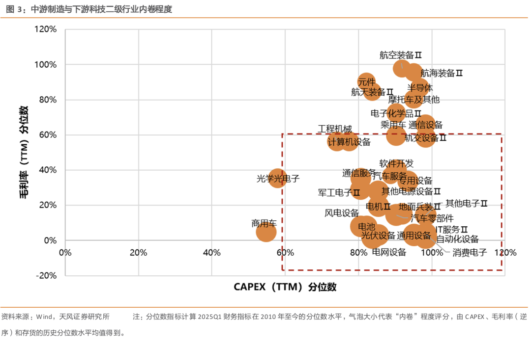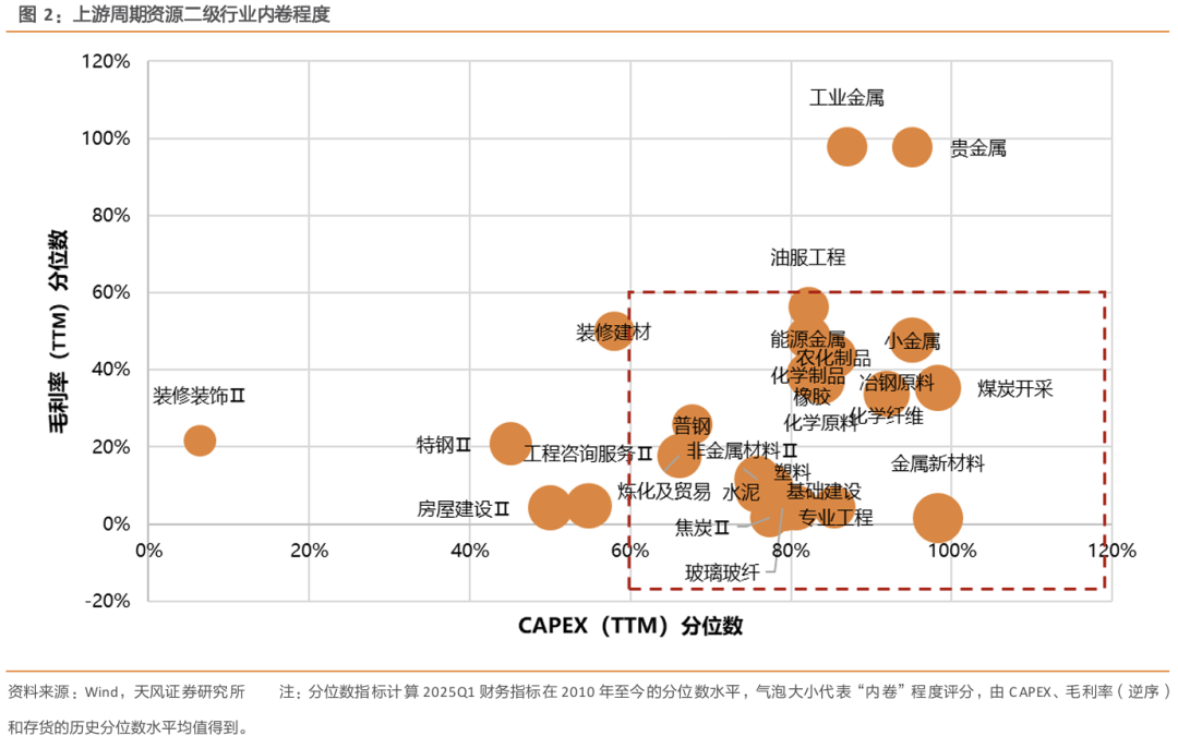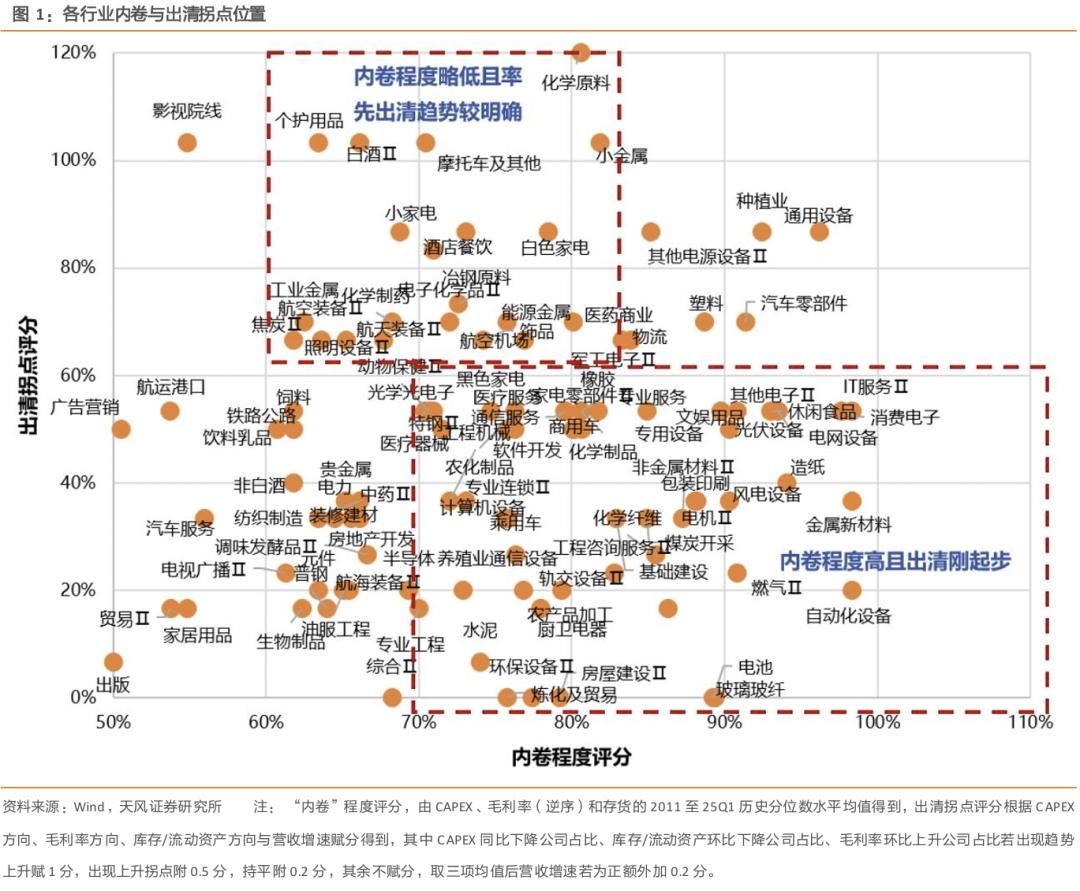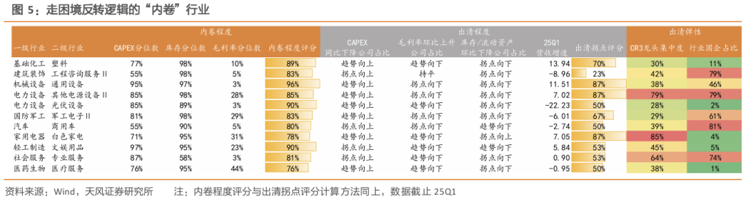 我们认为,本轮反内卷逻辑和供给侧结构性改革有所不同,本轮反内卷更侧重于成本调查和价格监测,治理企业低价无序竞争。提价本身需要行业的供给格局配合,我们从“内卷”程度、产能出清程度、产能出清弹性三个方面讨论哪些行业更具备基本面率先改善的潜质。以CAPEX、毛利率和存货的历史分位数水平衡量行业的“内卷程度”,以上述三个指标是否发生趋势的拐点判断行业出清是否启动,目的是筛选本身已经在去产能、出清的行业。