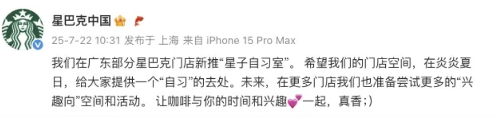 21热点观察室注意到,早在7月7日,@星巴克广州 就曾发文宣传自习室,鼓励大家晒出自习照。