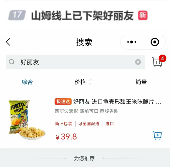 7月15日晚,不少网友表示在山姆会员商店App上无法搜到上述好丽友派。21世纪经济报道在山姆小程序上搜索“好丽友”,也仅剩下一款玉米脆片。