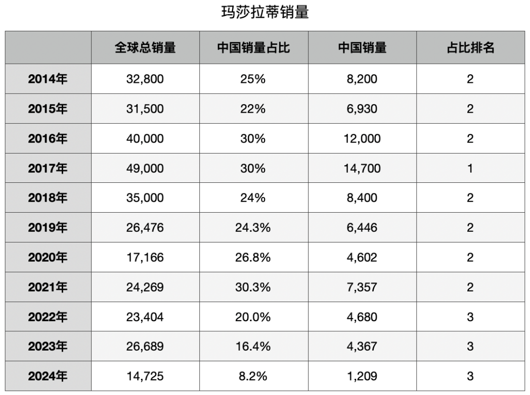 Stellantis集团年报显示,2024年玛莎拉蒂在华销量较2017年巅峰时期暴跌超过九成。另外据乘联会数据,2025年1-5月,玛莎拉蒂在华累计销量仅为384辆,同比锐减44%。