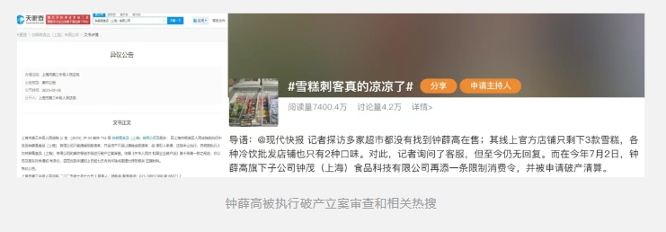 因为还不上债务,钟薛高最近被移送进行破产立案审查,微博上很快出了一条#雪糕刺客真的凉凉了#的热搜。