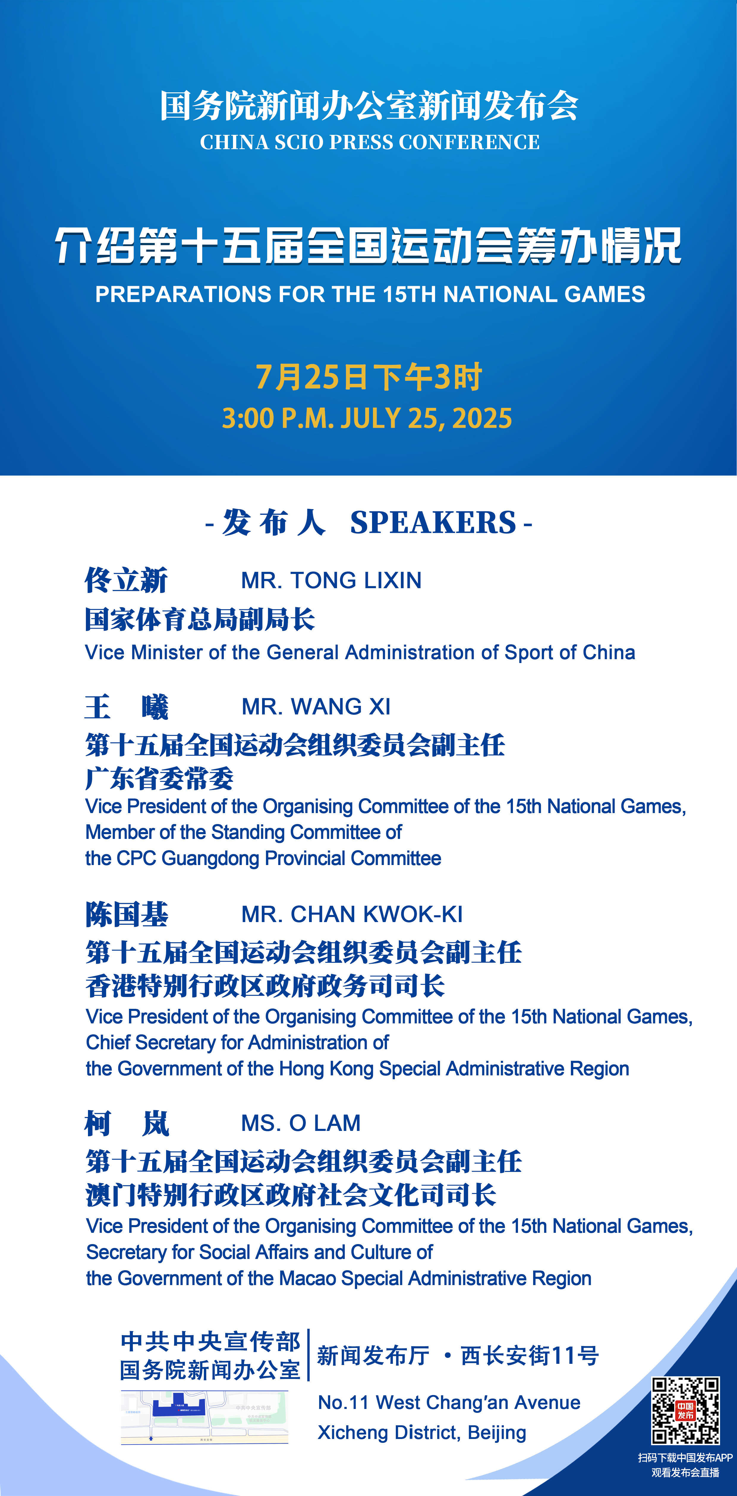 国务院新闻办公室将于2025年7月25日(星期五)下午3时举行新闻发布会,请国家体育总局副局长佟立新,第十五届全国运动会组织委员会副主任、广东省委常委王曦,第十五届全国运动会组织委员会副主任、香港特别行政区政府政务司司长陈国基,第十五届全国运动会组织委员会副主任、澳门特别行政区政府社会文化司司长柯岚介绍第十五届全国运动会筹办情况,并答记者问。