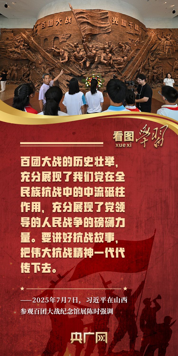 “要讲好抗战故事,把伟大抗战精神一代代传下去。”党的十八大以来,习近平总书记在地方考察调研时,多次到具有重大历史意义的革命圣地、红色旧址、历史纪念场所等缅怀革命先烈,重温峥嵘岁月,深刻阐释历史启迪。今年是中国人民抗日战争暨世界反法西斯战争胜利80周年,《看图学习》邀您一起跟随总书记的脚步,共同缅怀抗战先烈的丰功伟绩,继承和弘扬伟大抗战精神,为强国建设、民族复兴作出我们的新贡献。