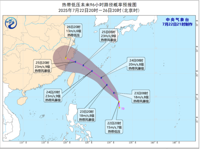 在22日17时,位于菲律宾以东洋面的热带扰动已发展为热带低压,新一个台风又在生成中。根据中央气象台消息,截至22日20 时,该热带低压位于距离琉球群岛那霸市南偏东方向约910公里的海上,预计其将以每小时20-25公里的速度向北偏西方向移动,强度逐渐增强。