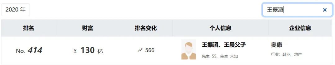 2012年,奥康国际上市,王振滔的身家突破50亿元。2020年,收获第二家上市公司康华生物时,王振滔与儿子王晨以130亿元的身家,登上胡润百富榜。