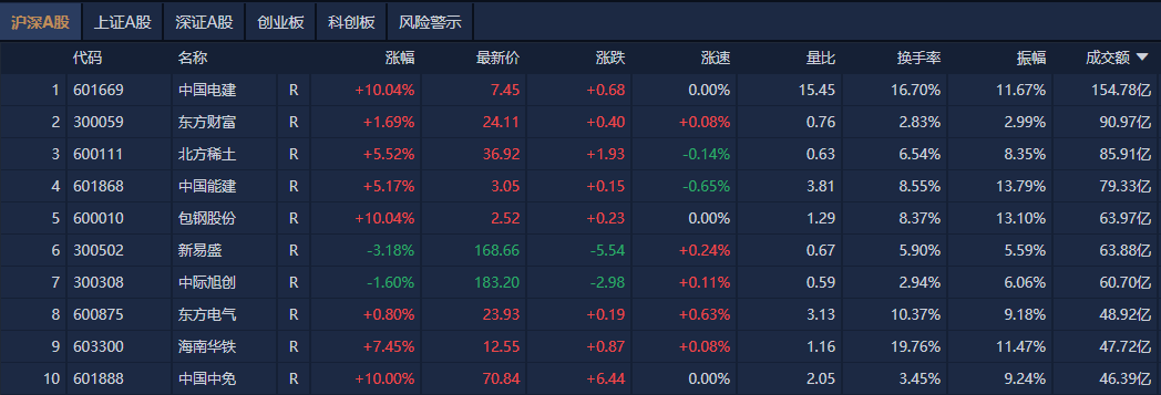 沪深两市半日成交额1.12万亿元,较上个交易日缩量230亿。个股方面,中国电建成交额超154亿元居首,东方财富、北方稀土、中国能建成交额靠前。