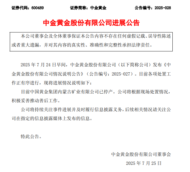 中金黄金(600489.SH)公告称,公司于2025年7月24日发布的《中金黄金股份有限公司情况说明公告》中提及的各项处置工作正在有序进行。目前,中国黄金集团内蒙古矿业有限公司已停产,公司将根据现场处置情况,积极妥善推动善后工作。公司将持续关注事件进展并及时履行信息披露义务。