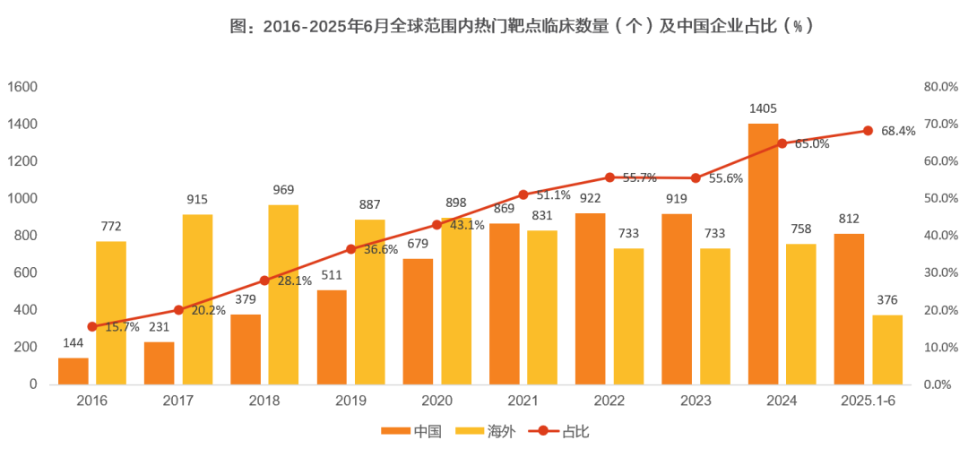 数量突破:中国企业自研创新药数量已位居第一;热门靶点管线中国占比已超过一半,截至2025年6月已突破60%。
