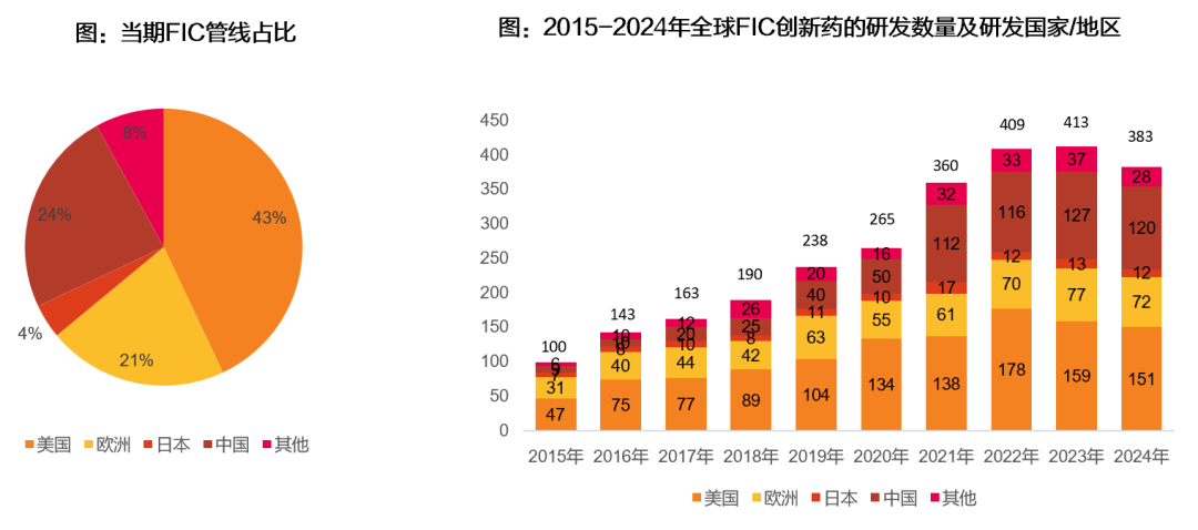 质量突破:FIC分子在全球范围内占比升至第二,仅次于美国。2015年中国企业自研的进入临床的FIC创新药只有9个,占比不足10%,而到了2024年有120个,中国在源头创新药品研发上的潜力不断释放。从现有FIC(同类首创,First-in-Class,FIC)管线看,中国FIC管线占全球比重已达24%,仅次于美国,研发的“真创新”含金量持续提升。
