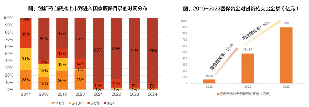 2、医保准入越发重要,对创新药支付增长快。中国创新药商业化进程与医保准入政策的绑定程度持续加深。2021-2024年医保谈判成功的创新药中,接近90%在获批上市2年内即进入医保目录,远高于2019年(43%)和2020年(57%),实现跨越式增长。