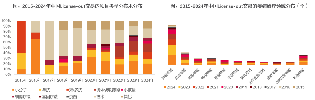 3、交易项目持续多元化。中国的License-out交易创新药品种日益多样化。从最初的化药、抗体类药物,到细胞基因疗法、小核酸药物和治疗性疫苗,交易内容逐步扩展。特别是在2024年,抗体类药物占比达37%,其中抗体偶联药物(ADC)License-out交易数量为20笔,与2023年持平,总交易金额达102.4亿美元,占所有License-out交易金额的20%。此外,小核酸药物在2024年取得显著进展,达成了2笔重磅交易,总金额超过60亿美元。