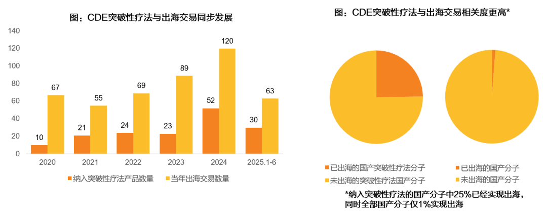 突破性疗法分子高出海成功率也证实了这一点:Insight数据库显示,纳入CDE突破性疗法的国产分子中有25%已经实现出海,同时全部国产分子仅1%实现出海。